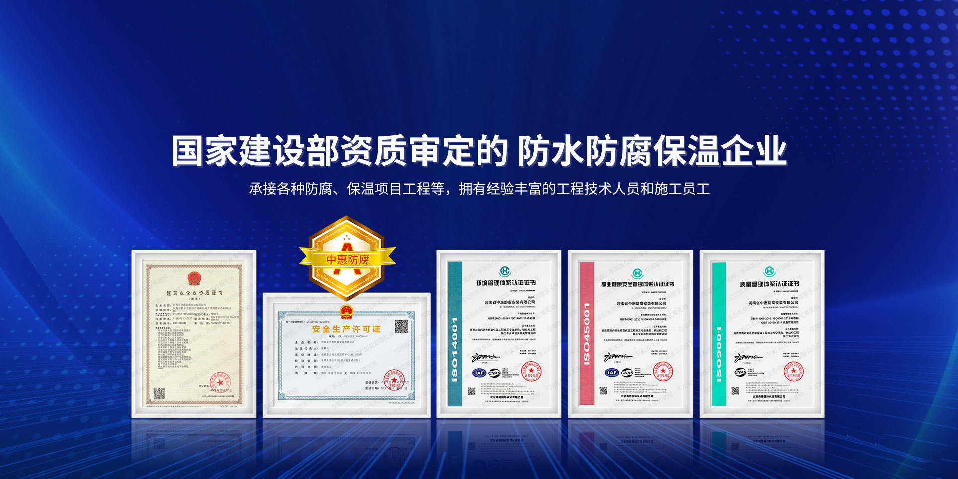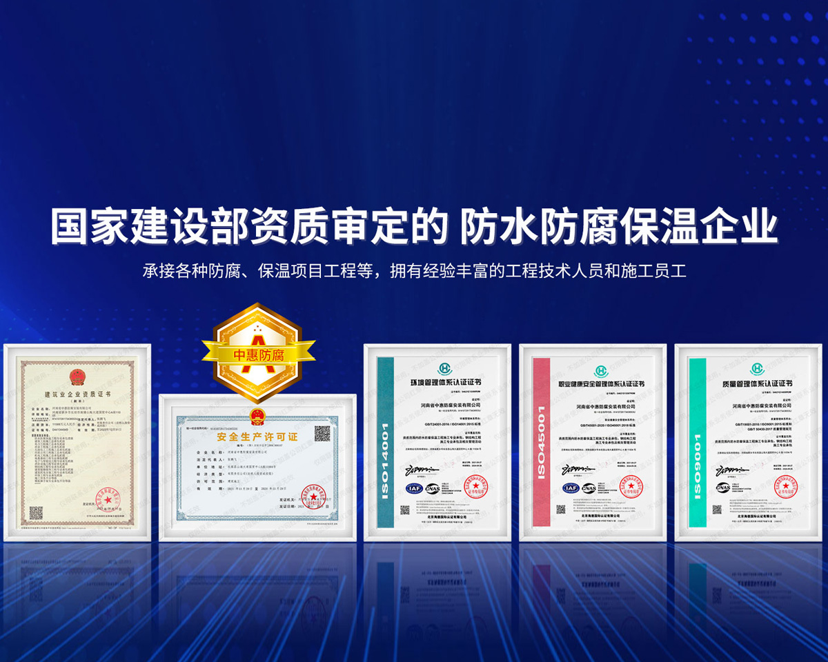 公司經營范圍:防水防腐保溫工程;消防設施工程;建筑裝修裝飾工程;建筑機電安裝工程;電力工程;建筑工程;石油化工工程;工業清洗工程;油罐清洗工程;鋼結構工程;環保工程;模板腳手架工程;電纜防火封堵、防污閃噴涂、外墻外保溫工程;各類施工勞務作業;設備維修、船舶鉚焊、涂裝;電力工程材料、建材、防水材料、防火材料、防腐保溫材料銷售,并相繼通過了GB/T19001-2008idtISO9001:2008GB/T50430-2007質量管理體系認證證書。GB/T24001-2004idtISO14001:2004環境管理體系認證證書。GB/T28001-2011idtOHSAS18001:2007職業健康安全管理體系認證證書。公司是中國防腐蝕于防護協會、中國施工企業管理協會、電力協會和中國鋼結構防水協會會員單位。 公司的經營業務涵蓋了石油、化工、電力、冶金、煤炭、船舶、國防、燃氣、水利、環保、交通運輸、航空及國防軍工和輕紡市政等行業的防腐保溫絕熱設備。鋼結構安裝、防火、防水、金屬噴鍍、聚脲噴繪、陰極保護、防滲透堵漏、玻璃鋼及各種磚版材料襯里、橡膠襯里、煙氣硫和耐酸溶劑腐蝕等工程施工。公司連續十年榮獲“省市先進施工企業”“安全生產先進單位”“重合同,守信用企業”和“AA***資質企業”的稱號。2000年被命名為市級文明單位,2002年被國家工商行政管理局命名為“重合同,守信用的企業”、被中國工業防腐蝕技術協會命名為“防腐蝕企業,能源節約及環境保護領域有豐富的經驗和***的業績。工程一次交驗合格率100%。其中攀枝花鋼鐵公司煉鐵廠四號高爐及熱風爐防腐工程、上海寶鋼公司煤氣柜防腐工程、撫順石油一廠裝置防腐項目、齊魯石化公司稀烴廠高塔防腐工程、吉林化學工業公司煉油廠油罐防腐工程、天津石化熱電廠六號爐頂棚聯絡管保溫工程、大慶油田(太倉)力神泵業工程、中國化學工程第十一建設工程、中原油田勘探局工程、中國石化銷售有限公司華北分部、魯皖輸油管道工程、貴州開磷息烽合成氨工程、陜西黃陵煤化工程、中國石油天然氣西部管道塔里木輸油工程、邯鋼集團邯寶鋼鐵公司煉鐵工程、德州供電工程、吉寶(南通)船廠工程,偃師華潤熱力工程、鄭州熱力總公司。 河南省中惠防腐安裝有限公司愿以豐富的施工經驗,***的技術,***的設備,***的管理,***的服務,竭誠為國內外廣大的用戶提供***滿意、******的工程作品。 我公司愿與國內外同仁一道,團結協作,共同推進防腐蝕行業發展! 公司地址:河南省長垣縣建設路北段360號 固定電話:0373-8866488 郵編:453400 網址:http://www_zhff_com_cn.yngsjj.com